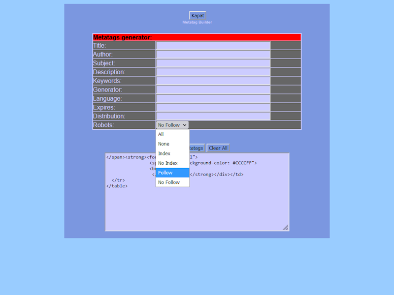 Metatag Builder: Yayında bir Web Siteniz var fakat Web Sitenizi SEO (Search Engine Optimization) Arama Motoru Optimizasyonu Noktasında Arama Motorlarında Web Siteniz aratıldığında Üst sıralarda olmasında Yardımcı olan bir araç