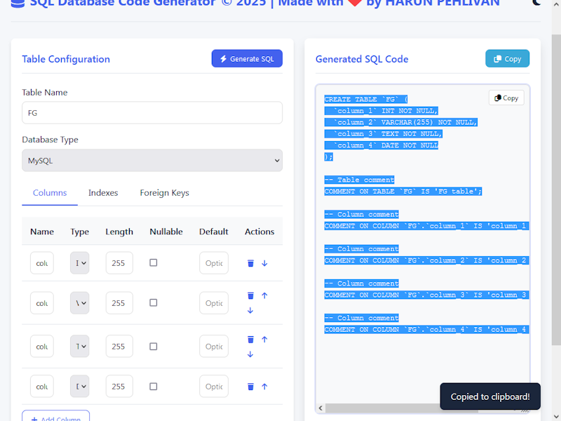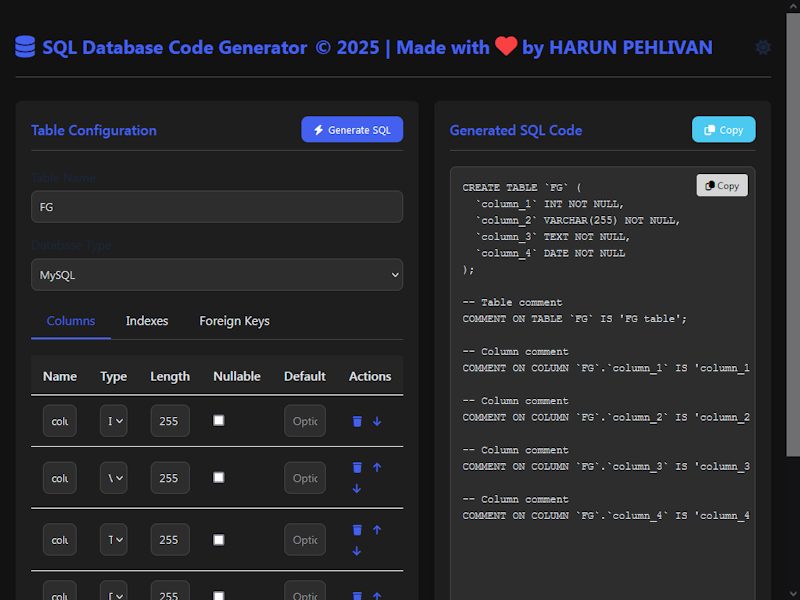 Welcome to the SQL Database Code Generator! This powerful web app simplifies database schema design by letting you visually create tables, columns, indexes, and foreign keys—then instantly generates clean, production-ready SQL for your preferred database system. Whether you're prototyping a new application, learning SQL, or managing database migrations, this tool eliminates manual coding errors while saving you valuable development time. Built entirely with HTML, CSS, and JavaScript, the application supports MySQL, PostgreSQL, SQL Server, Oracle, and SQLite with database-specific syntax. Its intuitive interface features real-time SQL previews, one-click exports, and a responsive design that works flawlessly on both desktop and mobile devices. Best of all, your work automatically saves in the browser, so you can pick up right where you left off—no installations or logins required!